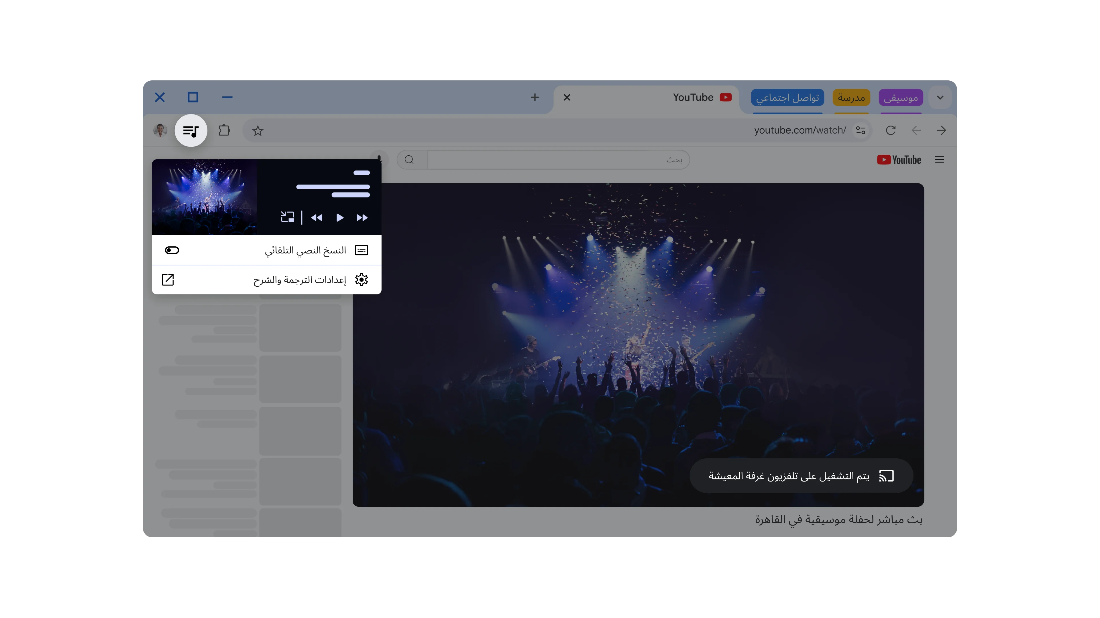 Google Cast وأدوات التحكّم في الوسائطاستمتِع بمشاهدة المحتوى كيفما شئتباستخدام Chrome، يمكنك بثّ المحتوى من الكمبيوتر أو الهاتف على جهاز التلفزيون المزوَّد بتكنولوجيا Google Cast. ويمكنك اختيار بثّ الشاشة بالكامل أو علامة تبويب محدَّدة فقط. مزيد من المعلومات عن عمليات